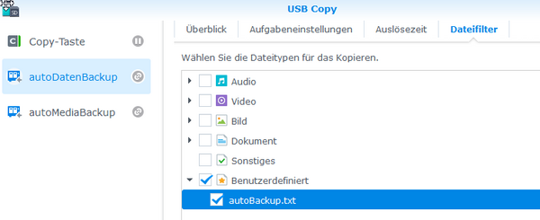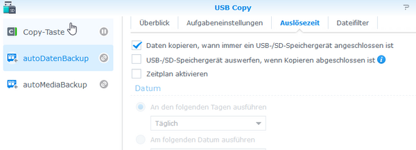 For my objective – triggering a Hyper backup job – I simply copy a flag file from predefined location on USB drive to a predefined location on NAS. So after connecting the USB drive a file named autobackup is copied to